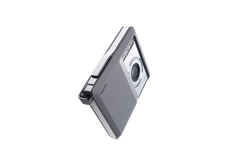 This is a concept model for Fuji Film Fine Pix digital camera. When you move your hand from right to left in front of the camera, the lens cover opens. We avoided giving it a gadgety feel and designed it to fit in with high standard living environments.