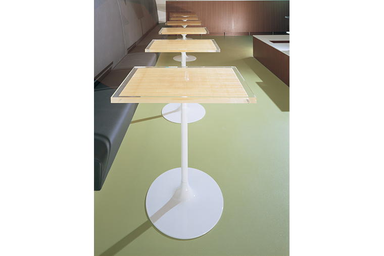 そのとき店内とテラス用にそれぞれデザインしたテーブルがFUMO OUTDOORとFUMO INDOORです。FUMO OUTDOORはシームレスをキーワードに継ぎ目の無い脚がアクリルの天板の中を貫通し支持している状態を追及しました。実際には脚部中央下部での溶接が必要となり、アクリルの天板も脚が貫通する構造はとれず別パーツを背面から差し込む構造になっています。しかしながら、デザイナーの無理難題をどうにか実現しようとがんばっていただいた職人さんには久しぶりに熱い職人魂を見せてもらった気がします。コンセプトどおりとは行かなかったものの、その軽やかなフォルムは非常に狭いテラスの空間で空気のように存在しています。