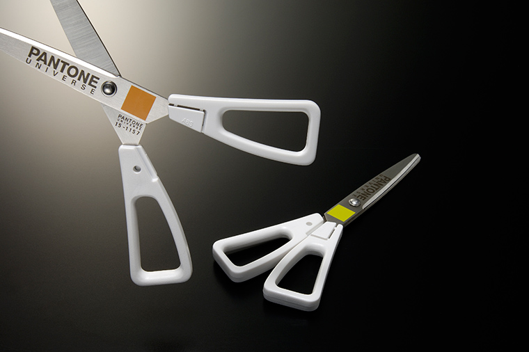 シングルソファに続きPANTONEブランドの文具が発売になりました。ステープラー、鋏、長さの違う定規3種類です。テーマは色と色番号の関係性です。ステープラーは閉じたときに色と色番号がカラーチップのように並びます。鋏は閉じていると色だけしか見えませんが、開くと色と色番号が並びます。定規は白い紙の上に置くと色番号が消えて色だけに。