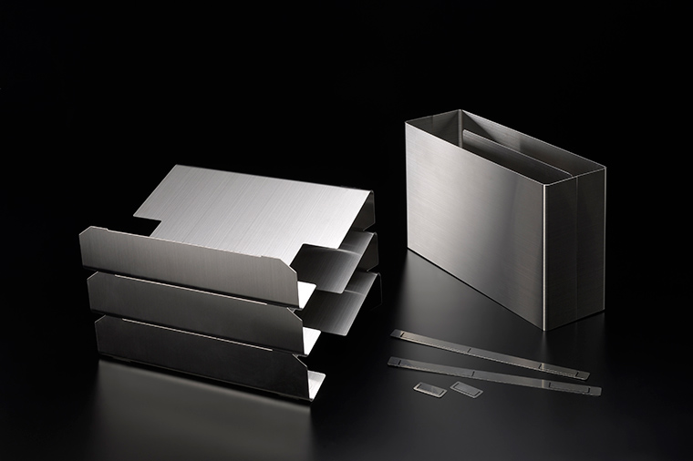 As part of local industry revitalization project in Tsubamesanjo, we teamed up with a local stainless steel fabrication company to produce stainless stationery items such as paper clips, folders, trays and cases. As the company was especially skilled in finishing edges, we managed to come up with safe and pliant prototypes using wafer-thin stainless steel.